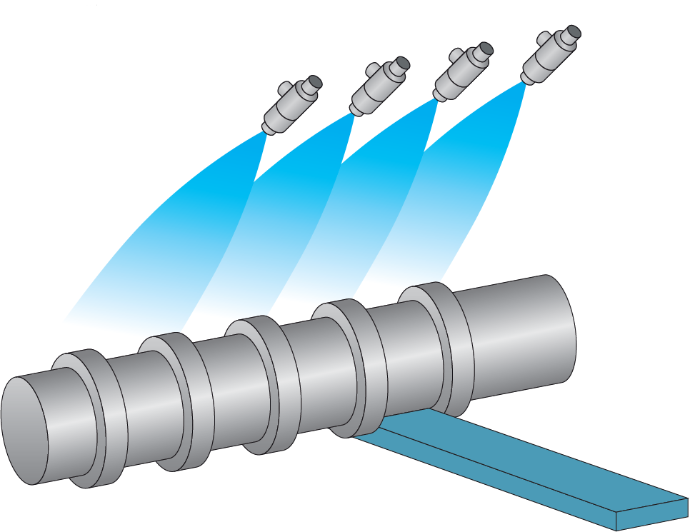 Voor het secundaire koelproces op de CCM is een sterke impactkracht nodig om door het kookoppervlak heen te breken. Om de staalplaten af te koelen, is een gelijkmatige sproeiverdeling met een zo hoog mogelijke impact nodig om een gladde oppervlaktestructuur te garanderen. Ikeuchi biedt de DOVEA pneumatische sproeinozzle aan. Deze kan een groot bereik aan sproeicapaciteit genereren zonder de sproeikant te veranderen.